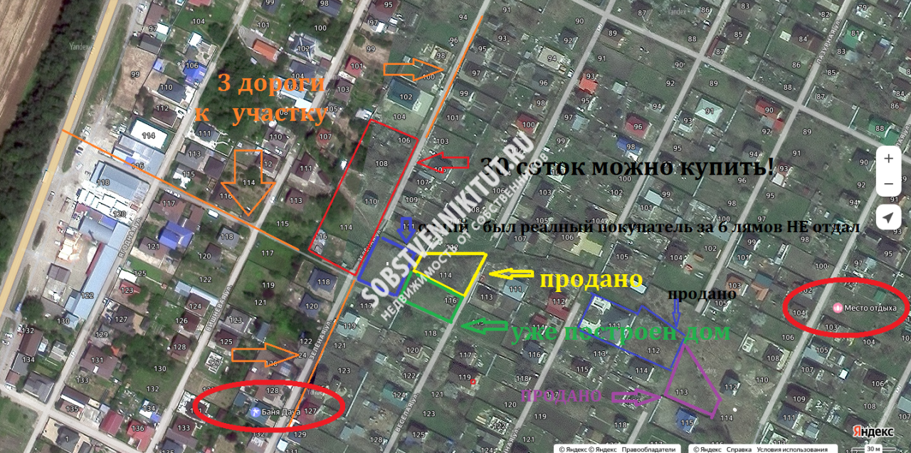 PS ещё соседние участки тоже продадут, на рисунке прочерчено оранжевым цветом, - с домиком 5 соток угловой по цене 5 лямов и пустой 5 соток 3 ляма будет 25 соток с фасадом 78 метров, за все время сколько существуют сайты где продают недвижку такого места ни кто ещё не предлагал в краснодарском крае, чтоб так сразу было - парк строить и за бабки пускать погулять